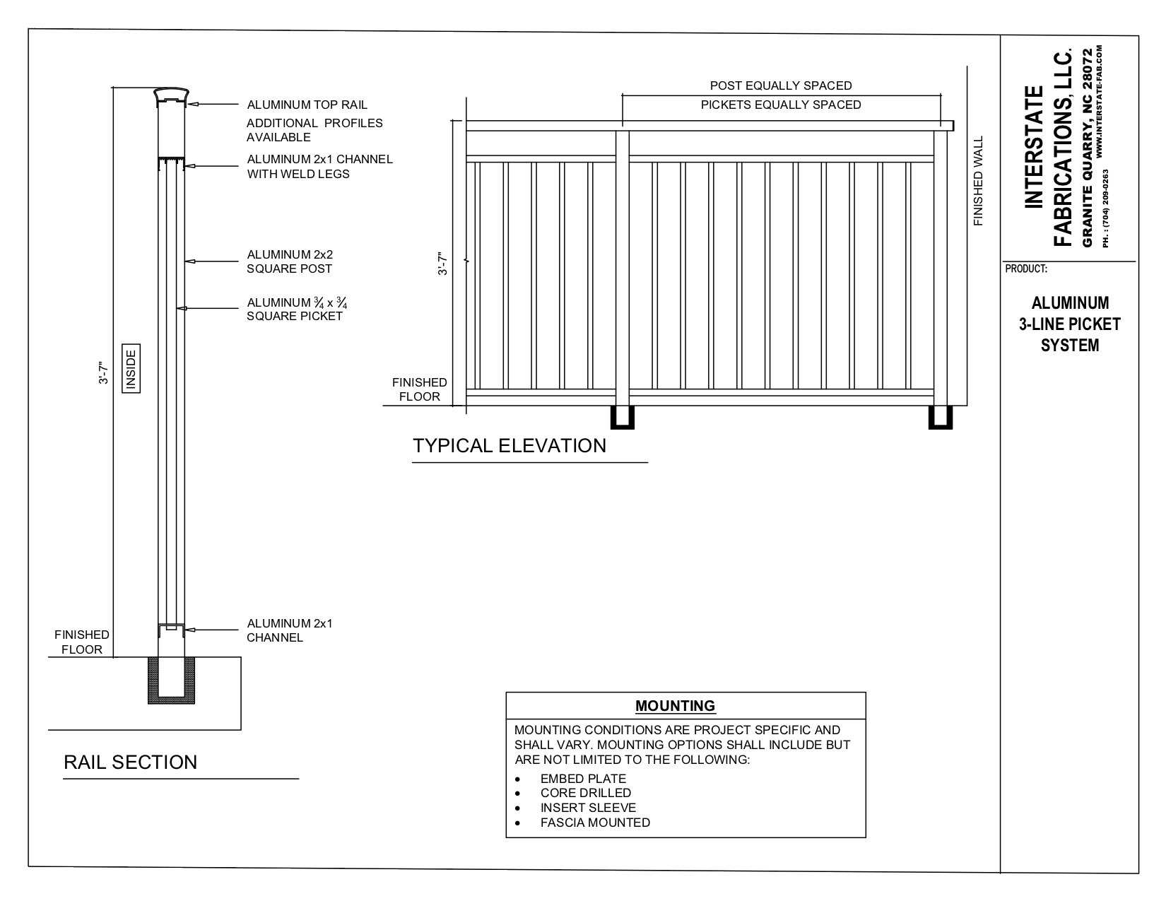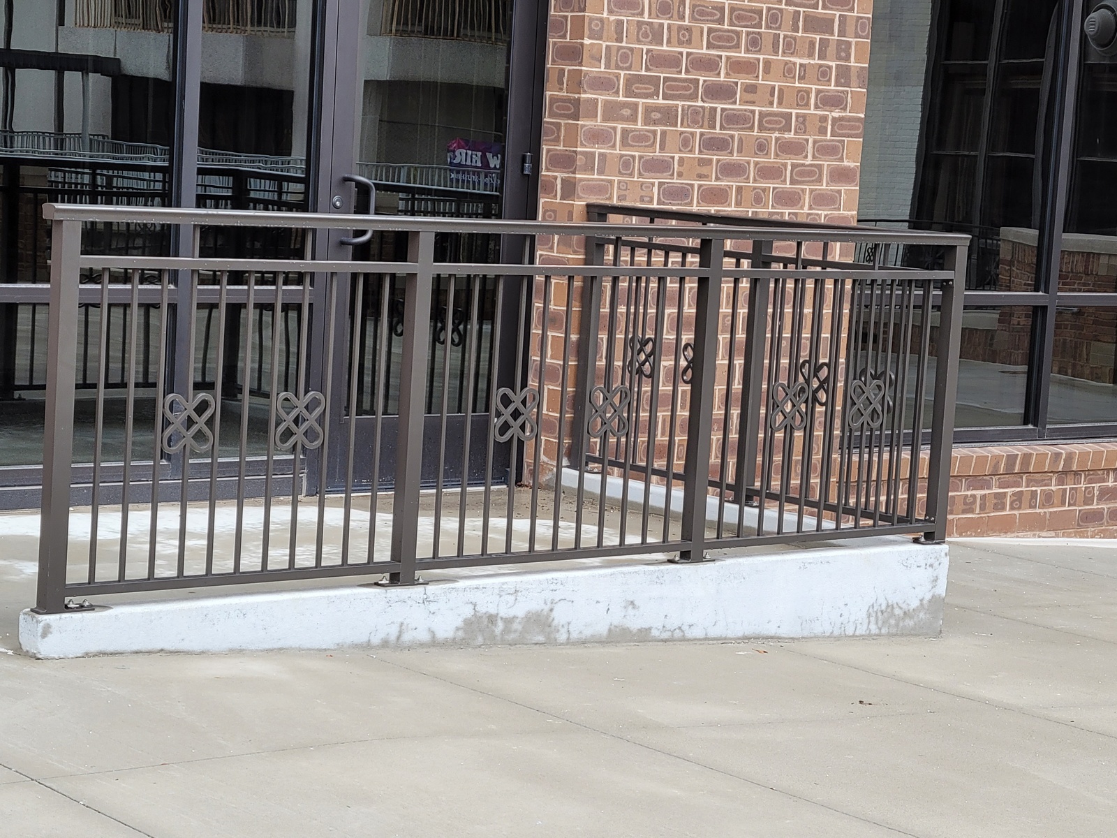 Our standard 3-line aluminum picket railing is perfect for your personal yard or porch. Common commercial uses include hotel balconies and pool railings. We also offer steel pipe railing.